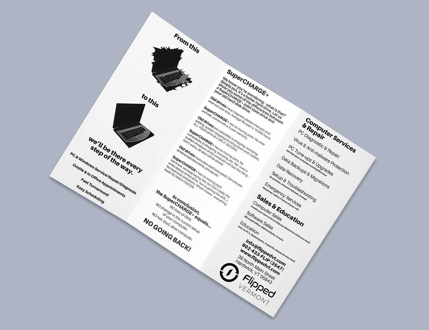 This brochure was designed with B2C business in mind. This allowed us to have a little more fun with the concept, and I developed the "done with computer problems?" slogan and graphic to relate to an audience that might not have so much experience with computers, and therefore be more frustrated than most. This brochure focuses less on the data security that Flipped Vermont offers to customers and more on the everyday consumer computer problems. It also explains the solid state drive to a demographic that is likely to have never heard of the concept.